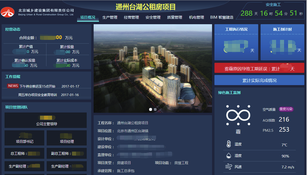项目概要的集成界面具备了信息集成,包括工期、经营动态、当前环境监测、工作提醒、项目概况信息、项目管理团队成员信息以及工程效果图等。