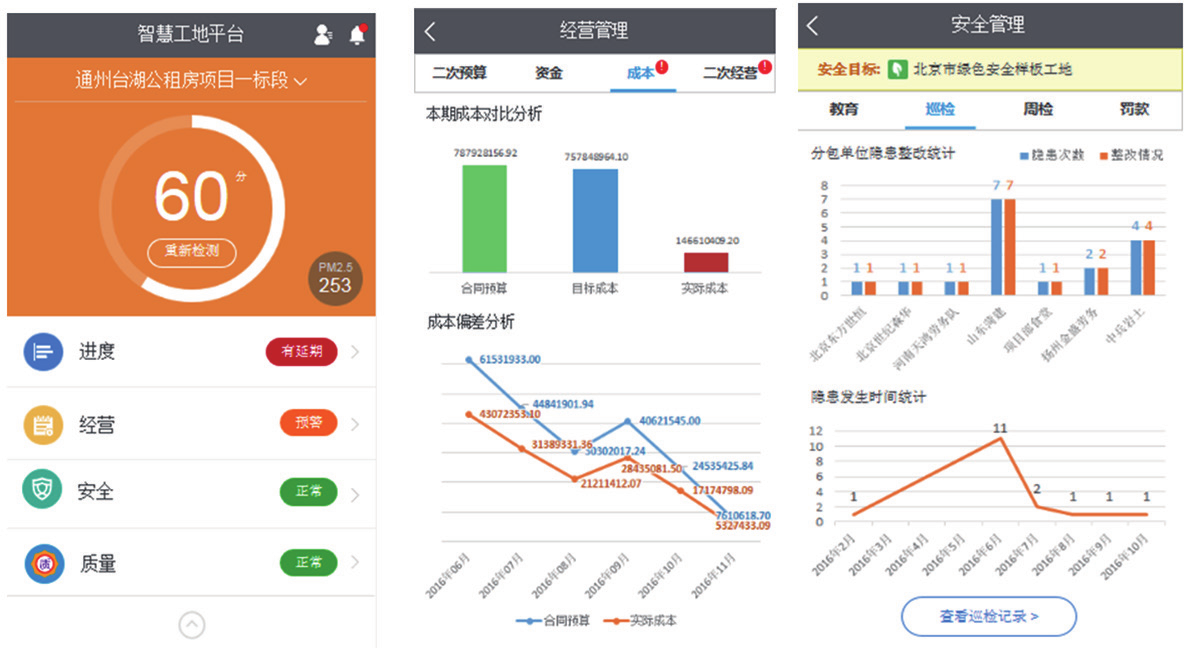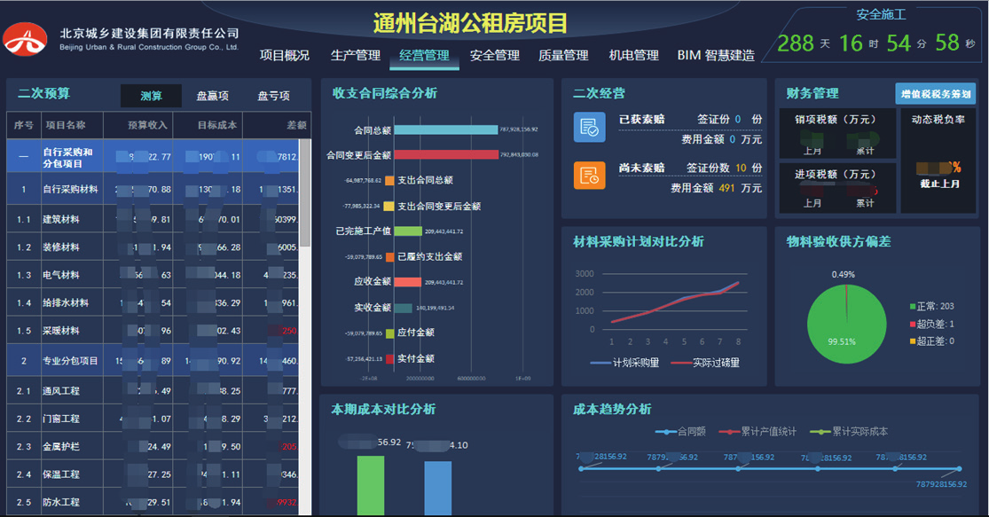 本项目经营管理,参考北京城乡项目成本管理制度和要求。重点在集成平台中体现,阶段性成本、资金以及合同履约等情况。同时,出于项目成本管理需求还将项目部使用的6686体育物资验收系统、6686体育物资管理系统等进行了整合与深度应用。
