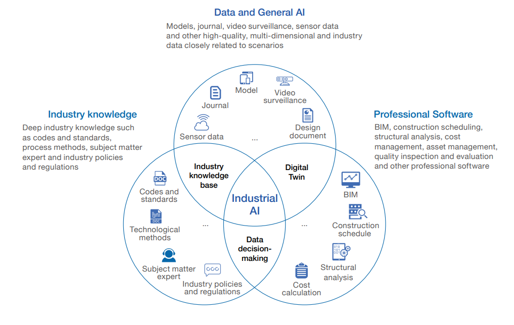 The white paper emphasizes that construction enterprises cannot rely solely on off-the-shelf general-purpose AI models to generate real business value. Instead, they must adopt Industrial AI — AI that understands the business, integrates deeply with real-world scenarios, and solves specific operational problems.