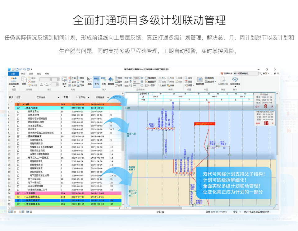 总计划从粗到细逐级细化可按需自动截取生成期间计划总计划从粗到细逐级细化可按需自动截取生成期间计划 真正打通多级计划管理,解决总、月、周计划脱节问题 工期自动预警,实时掌控风险 |